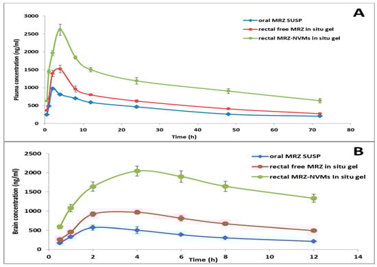 MRZ concentrations were assessed at intervals up to 12 and 72 h for the brain and plasma, respectively. Figure 9, in plasma (Figure 9A) and for the brain (Figure 9B), depicts the mean levels of MRZ over time elapsed after rectal and oral delivery, and then many PK variables (Table 3) were computed.