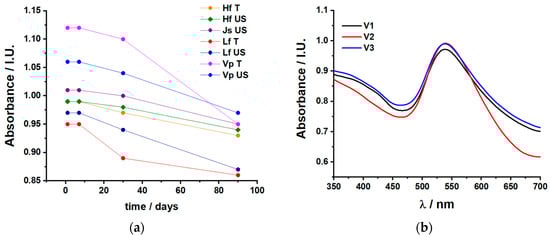 UV–Vis absorption spectra: (a) as a function of time dependency for all b-AuNPs (pressure-enhanced (T) and ultrasound-assisted (US) sea buckthorn extracts (HfT and HfUS); lavender extracts (LfT and LfUS); grape extracts (VpT and VpUS) and ultrasound-assisted walnut extract (JsUS)); (b) reproducibility of the b-AuNPs obtained from ultrasound-assisted sea buckthorn extract (HfUS).