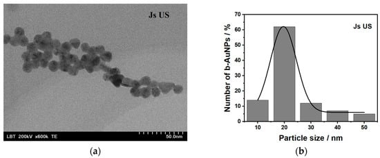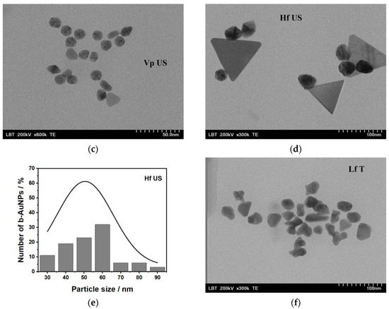 Overall, all samples showed good dispersibility; agglomeration/aggregation was only observed in the case of AuNPs (citrate). All b-AuNPs were polydisperse except those prepared using the walnut extract (JsUS). Hence, 63% of the analyzed particles had an average diameter of 19.6 nm. The broad absorbance maximum also confirmed the roughly spherical monodispersed nanoparticle shape at 528 nm. For the b-AuNPs, the rather sharp, well-defined absorption maxima at 525 and 540 nm prepared via VpUS and LfT should hint towards less monodispersed particles but still with a spherical shape [32]. However, this has only been confirmed for VpUS-reduced b-AuNPs that showed irregular shapes in the TEM pictures (anisotropy). For HfUS-reduced b-AuNPs, both anisotropies as well as polydispersity are best highlighted. The absorbance maximum at 538 nm indicated the presence of spherical particles. A second absorption maximum at 906 nm suggested the presence of clearly defined triangles. Triangle shapes were observed in the literature at various wavelengths, depending on their size and reducing agent. For an edge length up to 117 nm, a sharp absorption peak was observed at 700 nm for a high yield of triangular NPs [34]. Large triangular shapes (between 0.05–18 µm) were also observed in the NIR region, with a broad absorption maximum of around 1300 nm [35].