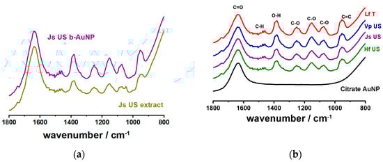The FTIR-ATR spectra of the fingerprint region 1800-800 cm−1 for (a) walnut plant extract (JsUS) and AuNPs reduced by this extract; (b) several samples of gold nanoparticles prepared using plant extracts (pressure enhanced lavender extract -LfT, ultrasound-assisted sea buckthorn -HfUS, grape -VpUS and walnut -JsUS extracts).