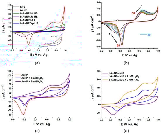CVs in 0.1 M NaPB, pH 7.0, scan rate 50 mV s−1, step 2 mV for (a) bare SPE and modified SPE with AuNP and b-AuNP (using pressure-enhanced lavender extract -LfT, ultrasound-assisted sea buckthorn -HfUS, grape -VpUS and walnut -JsUS extracts); (b) Stability for Js US reduced b-AuNP modified SPE; (c) AuNP modified SPE in the absence and presence of 1 and 2 mM H2O2 and (d) b-AuNP/Js US modified SPE in the absence and presence of 1 and 2 mM H2O2.