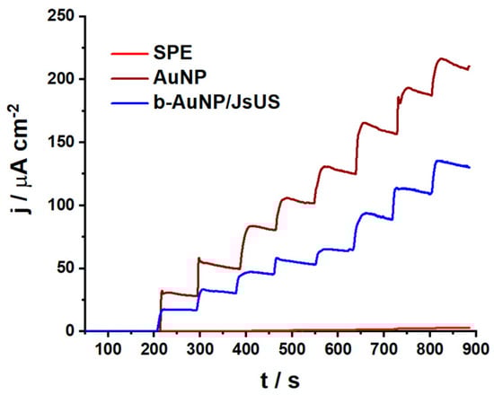 Amperometry at 0.65 V vs. Ag for H2O2 sensors: SPE, AuNP, and b-AuNP/JsUS (ultrasound-assisted walnut extract), in 0.1 M NaPB, pH = 7.0.