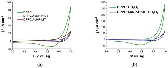 CVs in 0.01 M PBS, pH 7.4, scan rate 50 mV s−1, step 2 mV for (a) all DPPC liposomal systems (DPPC, DPPC/AuNP-HfUS (ultrasound-assisted sea buckthorn extract) and DPPC/AuNP-LfT (pressure-enhanced lavender extract)); (b) DPPC and DPPC/AuNP-HfUS in the presence of 3 mM H2O2.