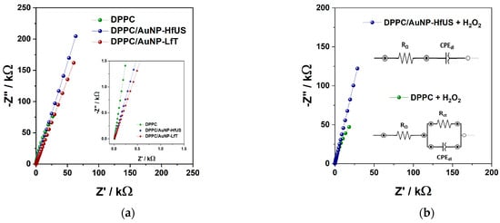 Nyquist spectra (EIS) in 0.01 M PBS, pH 7.4, applied potential of +0.1 V vs. Ag for (a) all DPPC liposomal systems (DPPC, DPPC/AuNP-HfUS (ultrasound-assisted sea buckthorn extract) and DPPC/AuNP-LfT (pressure-enhanced lavender extract)); (b) DPPC and DPPC/AuNP-HfUS in the presence of 3 mM H2O2.