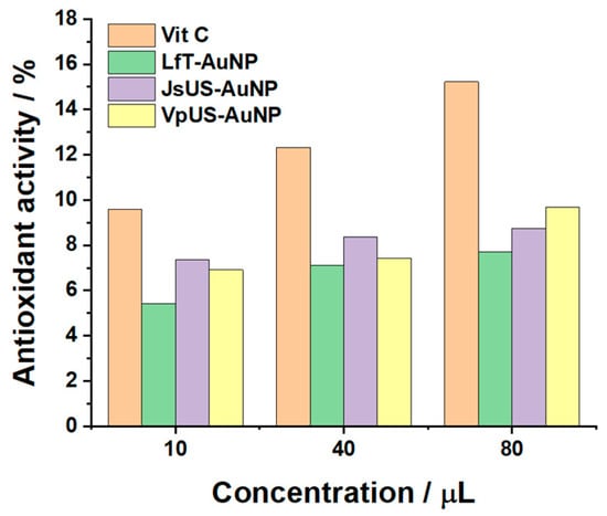 To validate these results, Figure 9 highlights the free radical scavenging property of the b-AuNPs in comparison to vitamin C for DPPH. The antioxidant activity is increasing with increasing concentrations of both Vit C and b-AuNPs. Even if not so powerful as vitamin C, VpUS-reduced b-AuNPs still present an antioxidant activity of 72% (for 10 µL) and ~63% (for the next two concentrations) from Vit C. Thus, all b-AuNPs present antioxidant activity, where b-AuNP/VpUS seem to be generating the most potent chain reactions.