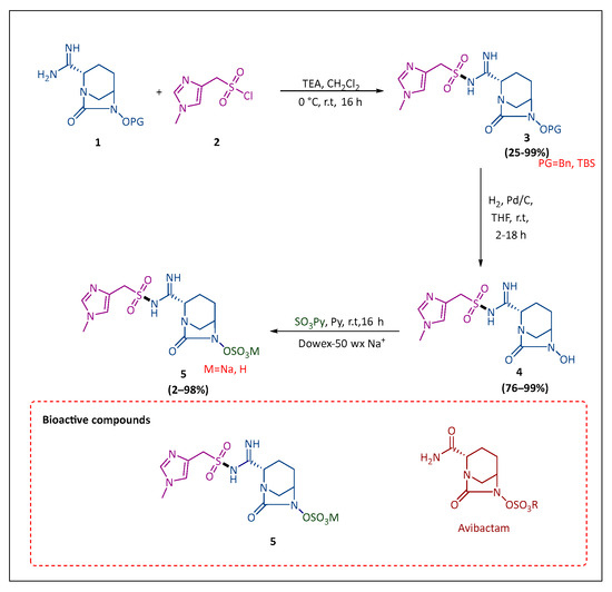 Clinically approved as an inhibitor of β-lactamase that is not dependent on β-lactam is avibactam. The diazabicyclooctane (DBO) family of antibiotics has two members: avibactam [40], which is the first member to enter clinical use with ceftazidime as the combination antibiotic, and relebactam, which was just approved when combined with imipenem [41]. Ji et al. effectively synthesized the new avibactam derivatives with sulfonyl amidine moieties at the diazabicyclooctane ring’s C-2 position. They evaluated the compound’s bacterial strains that are resistant to the in vitro effectiveness of antibacterial agents that expressed varied β-lactamase activity. The compound (1) was reacted with sulfonyl chlorides or anhydride (2) to form compound 3. These compounds were subsequently debenzylated using Pd/C to produce the respective OH derivative (4). The final compound (5) was subsequently produced by the reaction between the hydroxy compound (4) and the SO3–pyridine complex [42,43]. When compound (5) was compared to the control inhibitor, relebactam, it showed the most effectiveness against bacterial strains. Compound (5) (<0.0312) might be a promising candidate for further research (Scheme 1) [39].