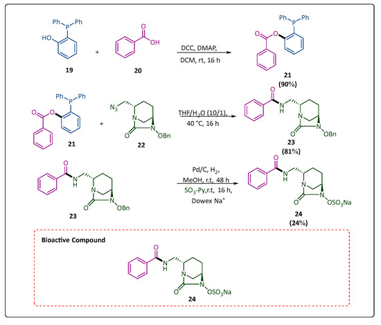 Two generations of inhibitors, based on the diazabicyclooctane scaffold (DBO; e.g., avibactam in 2015) [52,53] and a β-lactam (clavulanate in 1974) [54], have been successfully produced. The effectiveness of both kinds of inhibitors has been hindered, nonetheless, by the emergence of medical strains that become resistant to drug combinations after obtaining mutations containing ineffectively limited β-lactamases. This includes the acquisition of mutations during treatment as well as horizontal gene transfers [55]. Using a diazabicyclooctane (DBO) scaffold, Bouchat et al. studied the use of traceless Staudinger ligation to functionalize the C-2 position of inhibitors of second-generation β-lactamases. This was accomplished by creating a diazabicyclooctane (DBO) scaffold by ligating phosphine phenol esters to an azido-containing precursor. The phosphine phenol ester (21) formed when compound (19) and compound (20) were coupled with DCC and DMAP in DCM. Compound (21) and compound (22) were synthesized, and then both compounds underwent traceless Staudinger ligation in a mixture of (10/1) THF and H2O at 40 °C for 16 h to form the product compound (23). Compound (23) underwent a three-step process, which involved sulfurization with a sulfur trioxide–pyridine complex, hydrogenolysis in the presence of Pd/C to debenzylate, and elution using DOWEX Na+ to give compound (24) in a good yield. Compound 24 showed better inhibition of two of them (CTX-M-15 and OXA-48). Inhibitors were effective against these enzymes, especially OXA48, which is weakly inhibited by current DBO, and may be obtained by having access to the novel form of the amide linkage found in (24) (Scheme 5) [56].