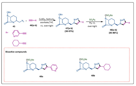 The diazabicyclooctane (DBO) design of inhibitors of second-generation β-lactamases makes β-lactams effective again against pathogenic bacteria, including those that produce enzymes of classes A, C, and D that are resistant to the β-lactam ring of inhibitors of the first generation. Bouchet et al. reported a synthetic pathway comprising triazole-containing DBOs that has been optimized. Furthermore, the biological evaluation of many compounds’ capacities to inhibit β-lactamases, common enzymes present in harmful Gram-negative bacteria, has been conducted. Compound (45) reacted with alkynes (46(a,b)) under CuAAC conditions, employing CuSO4 and the sodium salt of ascorbic acid in THF/H2O, during an overnight period at room temperature. Using the sulfur trioxide–pyridine complex, hydrogenolysis is used to deprotect the benzyl group of compounds (47). Filtration, residual dissolution in ethanol, and elution through DOWEX Na+ maximize the purity of the final product (48(a,b)). The most potent DBOs ‘’48(a,b)’’ in vitro were also some of the best substances for boosting β-lactam activity against E. Coli strains that produced CTX-M-15 or KPC-2 (Scheme 9) [65].