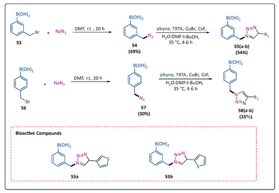 One of the biggest issues facing medical science today is the quickening rise in antibiotic resistance. In most cases, the development of enzymes of β-lactamases, including KPC-2, is the reason behind antibiotic resistance to β-lactams. Therefore, it is critical to find new inhibitors of KPC-2 and similar enzymes. Using the well-known 3-nitrophenyl boronic acid inhibitor, Zhou et al. designed and synthesized novel transition-state derivatives of boronic acid through the use of a 1,4-substituted 1,2,3-triazole linker. The development of KPC-2-development inhibitors that can once again become susceptible to the antibiotic cefotaxime appears to be promising with these scaffolds. The compound (53) reacted with sodium azide in anhydrous DMF to produce compound (54), which subsequently combined with TBTA to produce (55(a,b)). The compound (56) also reacted with sodium azide to produce compound (57), which was subsequently treated with TBTA to form compounds (58(a,b)). The meta-analogs outperform the corresponding para-analogs according to susceptibility tests and in silico docking results. The results indicated that substituents that have smaller sizes at the triazole ring’s 4-position are more likely to be allowed. This is probably because of better packing against the hydrophobic loop that lies between the a10 and a11 helices. However, compared to both 3-NPBA (3-nitrophenylboronic acid) and the thiophene derivatives ‘’55(a,b)’’, it was shown that the zone of the inhibition increased statistically significantly (Scheme 11) [67].