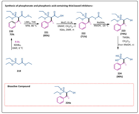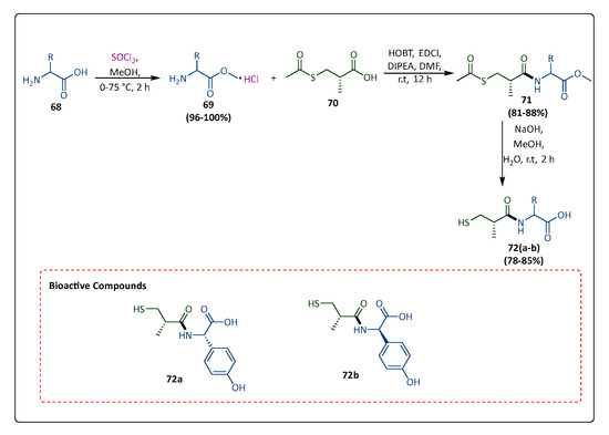 Public health is severely threatened by the advent and broad growth of metallo-β-lactamase (MBL)-mediated resistance to nearly all the β-lactam antibiotics. The search is now underway to find novel powerful broad-spectrum MBL inhibitors that are effective against antibiotic resistance, as there are currently no therapeutically relevant MBL inhibitors available. Liu et al. synthesized derivatives of 2-substituted (S)-3-mercapto-2-methylpropanamido) acetic acid. Many of these substances demonstrated potent inhibition to the therapeutically significant MBL subtypes with great ligand efficiency, Verona integron-encoded MBL (VIM)-2 and New Delhi MBL (NDM)-1. The compound (68) was reacted with SOCl2 in the presence of MeOH at 75 °C to produce intermediates (69) and (70), which were then used for the following step without being purified. Next, in the presence of HOBT, EDCI, and DIPEA, intermediates (69) and (70) underwent a reaction to yield the corresponding amides (71). Ultimately, the desired target compounds (72(a,b)) at room temperature were obtained by treating compound (71) with aqueous NaOH in methanol. According to molecular-docking investigations of (72) binding with NDM-1, (72) appears to be positioned to chelate with active-site zinc ions and interact with the catalytically significant residues, such as by creating hydrogen bonds with Lys224 and Asn233. The two most powerful compounds, ‘’72(a,b)’’, had LE values of 0.42 and 0.1, respectively, and showed inhibitory activities (IC50) of 3.57 μM and 5.59 μM, respectively (Scheme 14) [81].