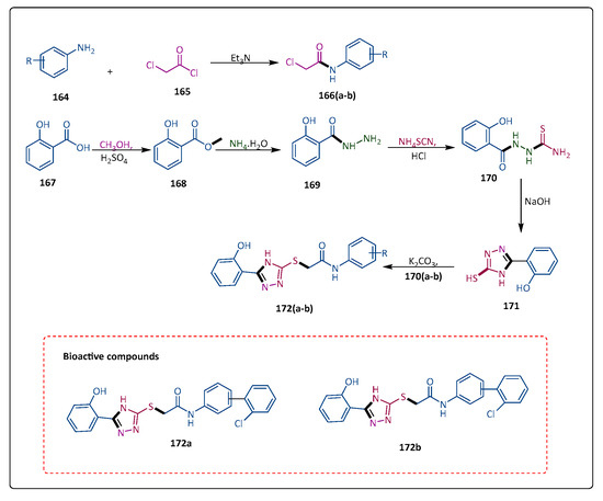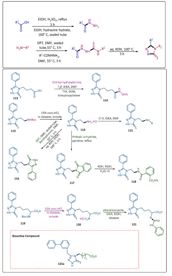 The primary mechanism by which Gram-negative bacteria resist β-lactam antibiotics is by the production of one or more β-lactamases (BLs), among which the highly problematic carbapenemases are one. Although these enzymes have recently been commercialized, inhibitors of these enzymes only work against serine carbapenemases (KPC-type, for example), and there is currently no effective inhibitor that can neutralize the metallo-β-lactamase (MBL) class. Gavara et al. synthesized a group of compounds with a heterocycle’s 4-position alkyl chain functionalized in a variety of ways. From the corresponding carboxylic acid, the hydrazide precursor of the substituent at position 5 is produced in two stages. Subsequently, DPT and the alkylamines R2 and NH2 reacted to produce intermediate isothiocyanates, which subsequently reacted directly with hydrazides to form the derivatives of the thiosemicarbazides. They obtain the 1,2,4-triazole-3-thione compounds by their basic treatment. By connecting (113) to O-trityl-hydroxylamine through trityl elimination in an acidic environment, hydroxamate (114) was generated. Compound (115) is produced from the Boc-protected precursor, and it reacts with (i) benzoyl and p-tosyl chlorides to yield compounds (116); (ii) DPT is followed by condensation with benzhydrazide and a hot basic treatment to produce the di-triazole-thione compound (118); (iii) phthalic anhydride is refluxed with pyridine to produce the phthalimide (117), which opened under basic conditions to yield (116). Compound (119) is produced from (120) by Boc removal, and it condensed to phenyl isocyanate to produce urea (121) in a good yield. Ultimately, the binding mechanism of the alkanoic analogs in the VIM-2 active region was investigated using docking assays. With Ki values of 5.50, 0.35, and 0.27 μM, respectively, compound 121a showed the strongest activities against VIM-1, VIM-2, and VIM-4 in this series, demonstrating the interest of an m-biphenyl group at position 5 (Scheme 23) [2,95,100,103].