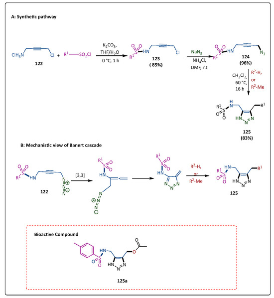 Metallo-β-lactamases (MBLs) hydrolyze all types of β-lactams, except monobactams. MBLs are a growing cause of antibiotic resistance in bacteria. Moreover, currently available serine-β-lactamase inhibitors do not reduce MBL activity. Muhammad et al. prepared numerous NH-1,2,3-triazoles using a three-stage procedure, with the Banert cascade reaction acting as a critical step. Biochemical experiments were used to assess the inhibitors’ characteristics against the MBLs GIM-1, NDM-1, and VIM-2. VIM-2 demonstrated IC50 values as low as the nanomolar range. The compound (122) produced chlorosulfonamides (123) by reacting with sulfonyl chlorides in a base (K2CO3), which then transformed to the corresponding azidosulfonamides (124(a–d)). In the presence of a variety of nucleophiles, the crude azides (125), carrying various sulfonamide groups, underwent the Banert cascade [104,105,106]. For a mechanistic proposal of the Banert cascade, see [106,107,108]. According to the docking, the findings unequivocally demonstrate that the inhibitors do not substitute the hydroxide ion and that the triazole moiety only interacts with one of the two zinc ions (Zn2), while the sulfonamide group is not involved in the zinc-binding process. With reasonable IC50 values of 48 μM (GIM-1), 23 μM (VIM-2), and 231 μM (NDM-1), 125a was the most promising inhibitor (Scheme 24) [79].
