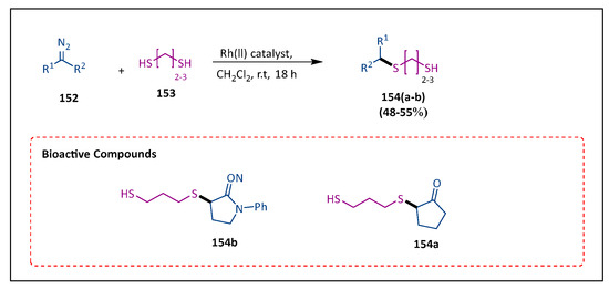 - Krasavin, M.; Zhukovsky, D.; Solovyev, I.; Barkhatova, D.; Dar’in, D.; Frank, D.; Martinelli, G.; Weizel, L.; Proschak, A.; Rotter, M. RhII-Catalyzed De-symmetrization of Ethane-1, 2-dithiol and Propane-1, 3-dithiol Yields Metallo-β-lactamase Inhibitors. ChemMedChem 2021, 16, 3410–3417. [Google Scholar] [CrossRef]