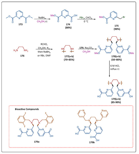 The NDM-1 metallo-β-lactamase in bacteria is strongly suppressed by several AMA and EDDS analogs. The compound’s inhibitory action and its capacity to bind zinc were found to be strongly correlated in isothermal titration calorimetry studies. Tehrani et al. developed several amino carboxylic acid analogs of ethylenediamine-N,N′-succinic acid (EDDS) and aspergillomarasmine A (AMA) by chemo-enzymatically synthesizing fumaric acid with a variety of mono- and diamine substrates added, which was conducted under the direction of the enzyme EDDS lyase, in Na2HPO4 buffer (pH 8.5). The compound (90) reacted with the diamine substrate (91) and purified EDDS lyase to produce compound (92), and (92a) showed one of the most effective synergies among the EDDS analogs that were studied (Scheme 18) [90].