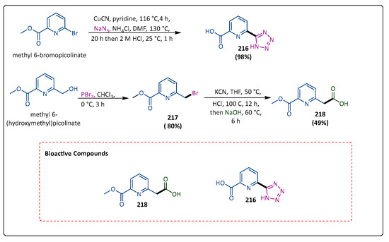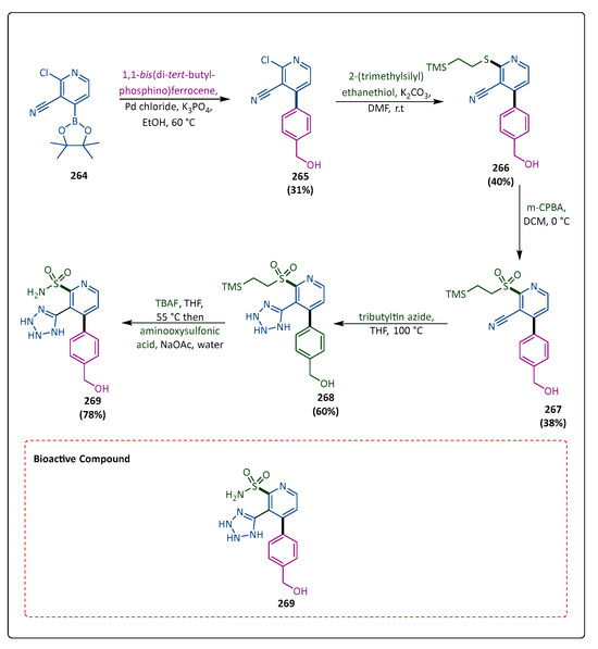 Metallo-β-lactamase (MBL)-induced β-lactam antibiotic resistance has become a global public health concern. At present, clinical trials are not able to use any MBL inhibitors. Using a hydroxyl group attached to zinc (II), MBLs attack the β-lactam carbonyl nucleophilically, breaking the ring in the process. Yan et al. employed C-H activation techniques to synthesize a range of ortho- and meta-mercaptopropanamide-substituted aryl tetrazole derivatives. They subsequently assessed the compound’s inhibitory potential in opposition to three MBL enzymes, namely, IMP-1, NDM-1, and VIM-2, in the presence of ZnBr2 and H2O. The compound (83) reacted with NaN3 to generate compound (84) [86], which reacted with iodoalkanes to form compound 85 [87]. Then, compound (86) reacted with 3-phenyloxazolidinone to yield the corresponding amides (86). Compound 86 further reacted with sodium hydroxide to produce (87) [88]. Compound (87) produced high yields of thioesters (88) by following the reaction with various carboxylic acids. Ultimately, compound (88) in the presence of NH3SH2O in an argon environment produced the required compound (89). Compound (89) showed strong inhibition of VIM-2 (IC50 = 0.035 mM) and moderate inhibitions of IMP-1 and NDM-1 (Scheme 17) [89].