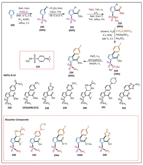 The development of acquired metallo-β-lactamases and enzymes of serine lactamase is the primary cause of resistance, which threatens the therapeutic efficacy of the crucial β-lactam class of antibiotics. Over the past few decades, numerous combinations of β-lactam/β-lactamase inhibitors have been effectively introduced to clinics to address this resistance issue. Davies et al. reported an understanding of a lead optimization campaign that led to the synthesis of the aminoguanidine analog ANT431 by palladium-assisted aminolysis and the identification of the candidate of preclinical ANT2681, a powerful inhibitor of NDM with great potential for clinical use. The compound (134) is known as ANT2681. The aminolysis of the bromosulfonamide with palladium catalysis, aniline chloroformate activation, and interaction with Boc-protected hydrazine via the isocyanate were the steps involved in the production of the crucial aminoguanidine analog (133). Then, (134) was obtained by selectively removing the Boc group and t-butyl ester, guanidinylation, global deprotection, and HPLC purification. Compound (134) can inhibit various MBL enzymes. Compound (134) also inhibited additional MBLs, and when combined with meropenem, it was effective against a variety of Enterobacteriaceae that produced MBLs (Scheme 25) [109].