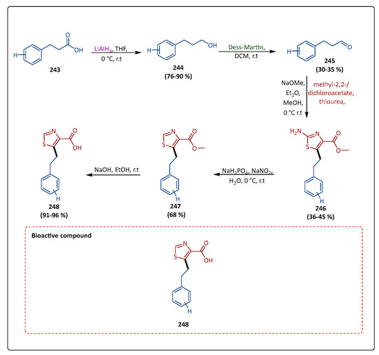 A variety of zinc-containing enzymes known as metallo-β-lactamases (MBLs) accelerate the hydrolysis of β-lactam substances, including carbapenems, which are the final choices for treating severe infections. To develop strong inhibitors of multiple B1 classes, Kaya et al. synthesized derivatives of N-aryl mercaptopropionamide. They also discovered a highly selective hit structure that reinstated the action of imipenem and lowered the minimum inhibitory concentration (MIC) values in resistant Escherichia coli isolates by up to 256 times. At 120 °C, aniline (73) reacted with 3-mercaptopropionic acid to give compound (74) in scheme section A. For the activation of the 3-(acetylthio)-mercaptopropionic acid, they used three different coupling reagents. Activation with EDC·HCl followed by the reaction with the corresponding aniline afforded compound (75). At room temperature, BOC deprotection was accomplished in the presence of TFA in dichloromethane (DCM), using sodium hydroxide to hydrolyze thioacetate in MeOH at room temperature and yielding the target compound (76) up to a yield of 97% in scheme section B. Hit compound (76) had a good log D7.4 value and was found to drastically lower the MIC values of several resistant bacteria that produce MBLs, including clinical isolates, restoring imipenem’s action (Scheme 15) [82].
