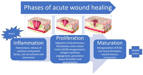 Wound healing (Figure 1) is an inflammatory process mediated by cytokines and growth factors and is a four-stage event: haemostasis, inflammation, proliferation, and remodelling [2]. Briefly, the healing process is marked by an initial inflammatory response in which haemostasis occurs by platelet activation and fibrin formation, followed by the migration of neutrophils, in the acute inflammatory phase, and later by the lymphocytes and macrophages, in the chronic inflammatory phase. A phase of cell proliferation and migration follows, where the migration of keratinocytes from the dermis occurs, and the formation of new blood vessels takes place. Thanks to the displacement of healing mediators, fibroblasts, and keratinocytes, a replacement of the fibrin-rich matrix by granulation tissue arises. Macrophages stimulate fibroblasts to differentiate into myofibroblasts as contacting cells, allowing for the attachment of wound edges. Those cells, along with the fibroblasts, will form the extracellular collagen-rich matrix. In the last phase, there is a reorganization and remodelling of this matrix, and the healing process becomes completed [5,16,17,20,21].