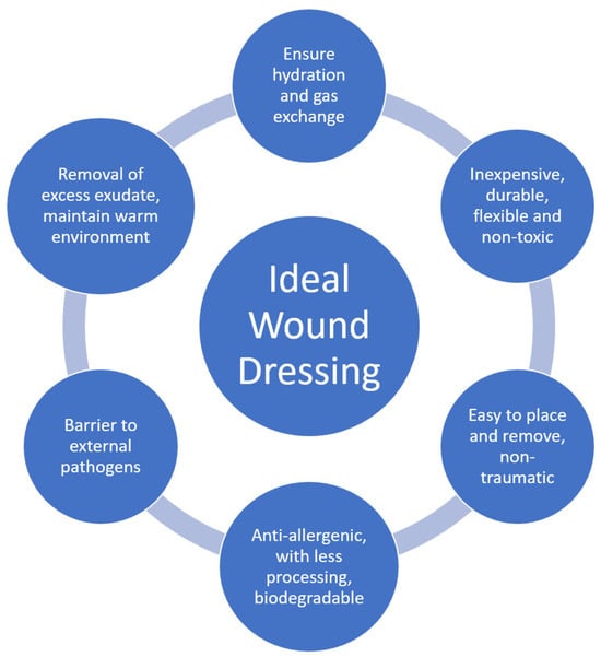 An ideal coating (Figure 2) must therefore have different properties, including being inexpensive, non-antigenic, durable, flexible, non-toxic, non-adherent, easy to place on lesions, applicable in a single operation, easy to remove, non-traumatic, composed of biological material (which requires minimal processing), not allowing water loss, adaptable to irregular lesion surfaces, allows for gas exchange and the removal of excess exudate, offers mechanical protection, protects from contamination, being biodegradable, and enhances the skin-inherent healing process. Coatings comprising biological material also require less processing with fewer adverse reactions [2,8,9,10,14]