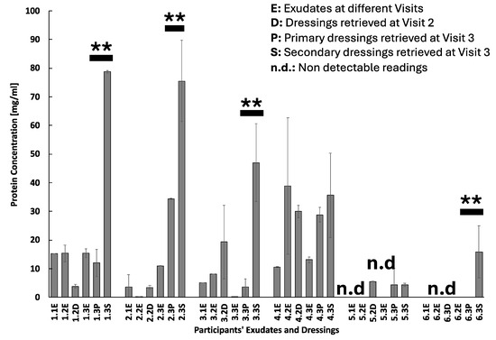 On Visit 2, the Melolin wound dressing was removed, and two sections (1.5 cm × 1.5 cm) were cut where the exudate was absorbed. Each section was collected either in 5 mL of sterile PBS for cell studies or in sterile deionised water for protein adsorption studies.