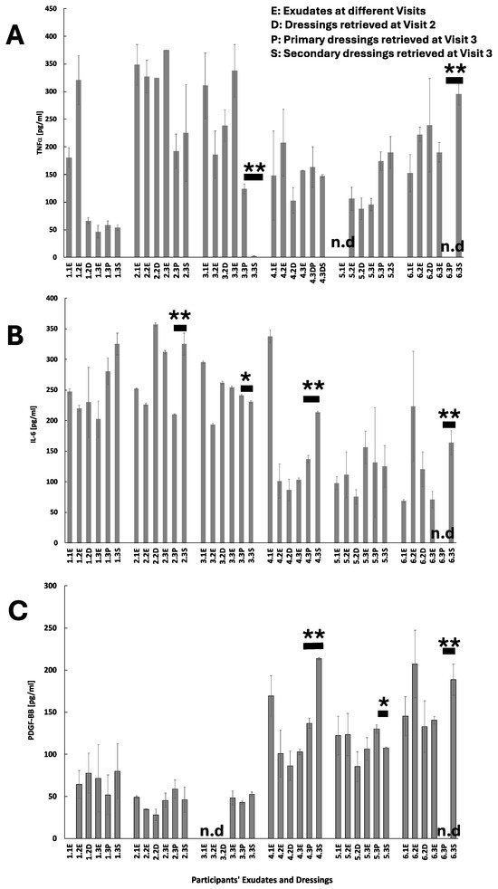 Protein concentrations in both exudates and eluates of the dressings were measured by using Bradford’s assay (BioRad, Watford, UK), while TNFα, IL-6 and PDGF-BB concentrations were measured by using ELISA (Abcam, Cambridge, UK). The choice of these three factors was made on the basis of their widely accepted role in the healing process, whereby TNFα is involved in the early acute phase of inflammation, IL-6 contributes to the acute inflammatory process while playing a role in its transition to healing steps, and PDGF-BB is released by both activated platelets and macrophages considered the most potent inducer of fibroblast proliferation.
