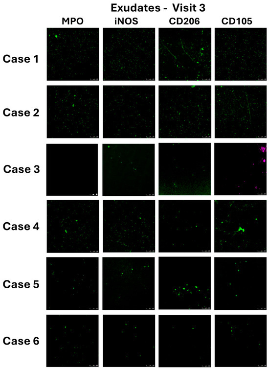 v bovine serum albumin solution as blocking agent to eliminate any subsequent non-specific binding of the antibodies. After further washes in PBS, the samples were incubated in antibody (rabbit anti-human MPO, CD68, iNOS, CD206 and CD105 Abcam, Cambridge, UK) solution diluted 1:100 in the same blocking solution for 1 h, room temperature. Following the same washing procedures, a secondary FITC-conjugated goat anti-rabbit IgG antibody solution diluted 1:100 in the same blocking solution was added for 1 h at room temperature and in dark conditions. Confocal microscopy was performed on all smears and dressing samples at ×20 magnification.