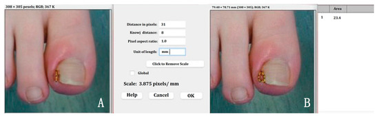 The maximum length and width of the wounds were measured by a research podiatrist by using a sterile paper ruler and photos were taken at every visit. The wound area was then calculated using ImageJ software, as elucidated in