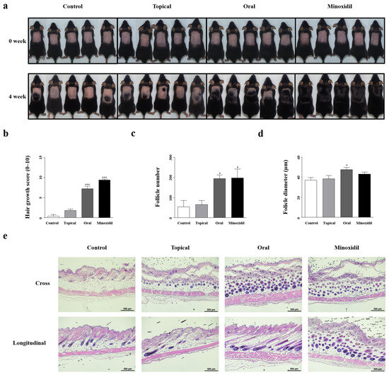 - Kim, Y.-J.; Kim, T.-K.; Min, B.-H.; Kim, S.-J. The Effect of LhGH on Hair Regeneration in C57BL/6CrN Mouse. Appl. Microsc. 2011, 41, 47–53. [Google Scholar]