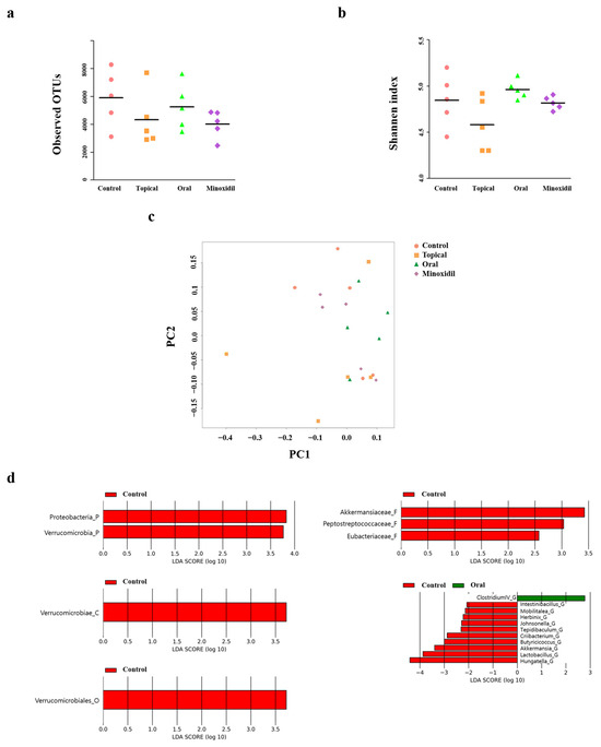 - Jung, D.R.; Yoo, H.Y.; Kim, M.J.; Singh, V.; Park, S.H.; Jeong, M.; Park, B.J.; Shin, J.H. Comparative analysis of scalp and gut microbiome in androgenetic alopecia: A Korean cross-sectional study. Front. Microbiol. 2022, 13, 1076242. [Google Scholar] [CrossRef]