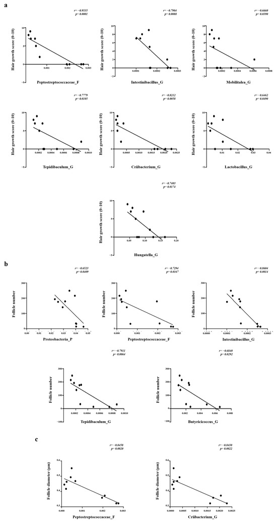 2.5. Correlation between Selected Gut Microbiota and the Number and Diameter of Hair Follicles