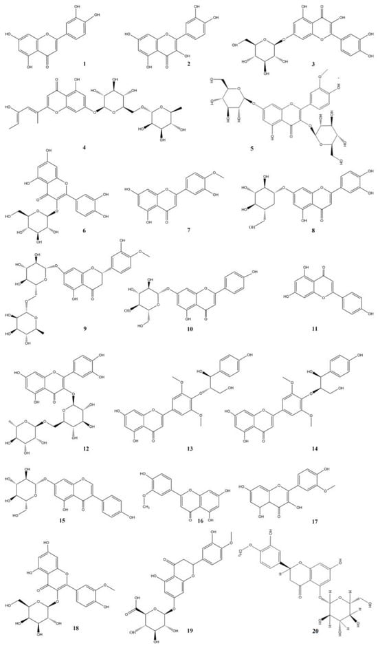 Flavonoids are a type of natural product that widely exists in the plant kingdom and generally take C6-C3-C6 as the basic carbon chain skeleton. Flavonoid metabolites generally possess the ability of defense, allelopathy, inhibition of harmful bacteria, and antioxidation [38]. The grass, roots, stems, leaves, and flowers of Taraxaci herba all contain flavonoids, and the aboveground parts are the most abundant. The content of flavonoids in Taraxaci herba is approximately 1.35%, of which luteolin (1) is the highest, followed by luteolin-7-O-β-D-glucoside [39,40]. Yun Ling separated 9 kinds of flavonoids from the ethanol crude extract of Taraxaci herba, which were as follows luteolin (1), diosmetin [41], apigenin (11), hesperetin 7-O-β-D-glucuronide (19), rutin [41], isoquercitrin (17), quercetin-3-O-β-D-galacoside, quercetin (2), luteolin-7-O-β-D-glucoside [39,42,43]. Yao Wei [44] also separated luteolin (1), luteolin-7-O-β-D-glucoside [39], and quercetin (2) from the crude ethanol extract of Taraxaci herba by chromatography. Rong Wang et al. [45] extracted hesperetin 7-O-β-D-glucocuronide (19) and hesperetin 5-O-glucoside (20) from Taraxaci herba for the first time by optimizing the water extraction method. Milovanovic Stoja extracted the flavonoids (208.6–564.5 μg QE/g) and phenolic (5.5–12.1 mg GAE/g) active components from dandelion seeds by supercritical fluid extraction technology [46].