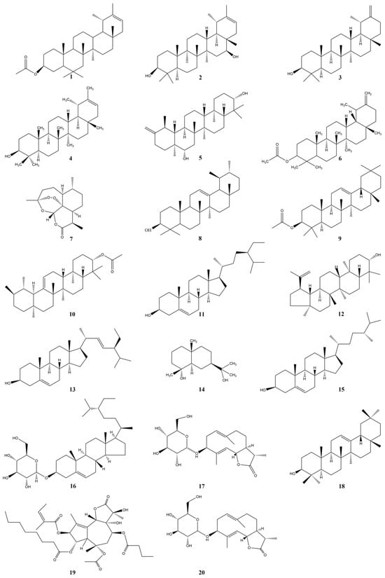 The triterpenoids in Taraxaci herba are mainly pentacyclic triterpenoids. Yun Ling [54] initially discovered two triterpenoids from the crude ethanol extract of Taraxaci herba, namely psi-taraxasterol acetate (1) and psi-taraxasterol (4) palmitate. Taraxasterol [41] is a triterpene compound isolated and identified from the pollen, roots, and leaves of Taraxaci herba, and it is one of the main active components of Taraxaci herba with anti-inflammatory and anti-tumor effects. Schütz et al. isolated taraxasterol [41], psi-taraxasterol (4), and arnidiol [41] from Taraxaci herba, and the content in the root of Taraxaci herba was significantly higher than that in other parts [9]. Sesquiterpenes in Taraxaci herba are mainly sesquiterpene lactones (19), and sesquiterpenes are the main components of the bitter source of Taraxaci herba [55]. Zhiyun Meng et al. identified the content of monomeric sterols in Taraxaci herba. The results showed that the content of β-sitosterol (11) was the highest, followed by stigmasterol (13) and campesterol (15) [56].