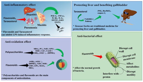 Taraxaci herba not only has certain anti-inflammatory, anti-oxidation, and anti-cancer effects but also has the functions of improving immunity [137,138,139], lowering blood sugar and blood fat [140,141,142,143,144], protecting liver and gallbladder [145,146], diuresis, anticoagulation [147,148] and depression [149].