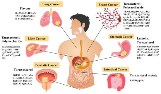 Colorectal cancer (CRC) is the third most common cancer in the world, as recognized by the WHO [130]. Tao C observed that the mortality of CRC patients with high expression of the RNF31 protein was much higher than that of patients with low expression of RNF31. Taraxasterol acetate could promote the degradation of RNF31 and then inhibit the mutation of the P35 gene, thus playing an anti-cancer role [131,132]. Le, by testing the effect of Taraxaci herba flavone (TF) on cancer cells in the Lewis mouse lung cancer model, it was found that under the influence of 200 μg/mL TF, the levels of CD4+, CD8+ and CD4+/CD8+ in cancer cells increased, the levels of IL-2, IL-3, IFN-γ, and TNF-α increased, and the expression of Ki67 decreased significantly, thus inhibiting the proliferation of lung cancer cells and improving the host’s immunity [133]. In addition, Taraxaci herba has an inhibitory effect on glioma, leukemia, pancreatic cancer, melanoma, and esophageal cancer in vitro and in vivo, or it can be used as a radiosensitizer to assist in the treatment of cancer [134,135,136]. The anti-cancer and anti-tumor mechanisms of Taraxaci herba need to be further explored through experimental research and clinical practice in order to develop them into potential natural anti-cancer drugs. We present the anti-cancer mechanism of Taraxaci herba in the form of pictures. For details, please refer to Figure 6.