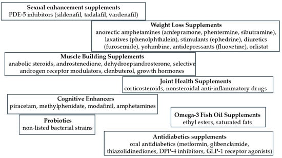 - Czepielewska, E.; Makarewicz-Wujec, M.; Różewski, F.; Wojtasik, E.; Kozłowska-Wojciechowska, M. Drug adulteration of food supplements: A threat to public health in the European Union? Regul. Toxicol. Pharmacol. 2018, 97, 98–102. [Google Scholar] [CrossRef] [PubMed]