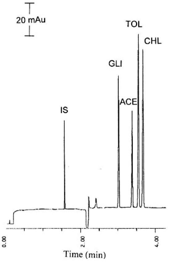 | CZE | 100 mM of phosphate–borate, pH 7.50, 15 kV, 30 °C UV detection 200 nm | traditional Chinese medicines | acetohexamide, chlorpropamide, glibenclamide, tolbutamide | [24] |