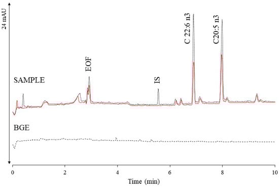 | CZE | 30 mM of sodium tetraborate, 12 mM of Brij 35, 33% methanol (v/v), 17% acetonitrile (v/v), 27 kV, 27 °C, UV detection 200 nm | marine oil gelulels | eicosapentaenoic acid, docosahexaenoic acid | [55] |