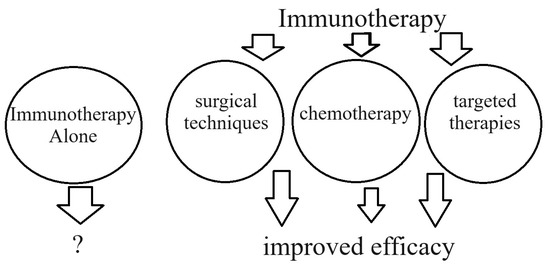 Little is known about the complex etiology of gastric cancer (GC). Patients with GC still have a poor prognosis [1]. There are still certain drawbacks to the current treatment options, which primarily involve surgical techniques (open versus laparoscopic) and chemotherapy (which has serious side effects). Moreover, the outlook for advanced GC regarding the best strategy is still concerning since there is no standard. Through its mechanism of action, immunotherapy has great potential for GC treatment [2]. Numerous immunotherapies have covered further indications and earlier therapeutic lines since the Food and Drug Administration first approved pembrolizumab in the KEYNOTE-059 clinical trial 2017 [3]. Immunotherapy is not the first step in GC treatment. However, the efficacy of immunotherapy combined with other different therapies (chemotherapy, surgery, and targeted therapies) is continuously improving [4]. However, how effective is immunotherapy alone in treating gastric cancer? (Figure 1).