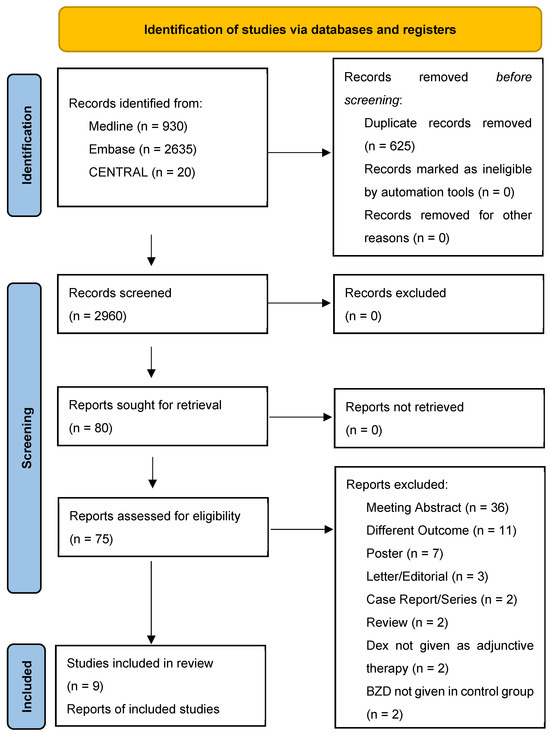 A total of 3585 papers were retrieved: 2635 from EMBASE, 930 from Medline (via Ovid), and 20 from CENTRAL. After eliminating duplicates, 2960 papers were screened by title and abstract; 75 out of the 2960 papers were read in full text (Figure 1). The qualitative synthesis has included nine out of all manuscripts read in full text (Table 1). Of the nine studies included in the qualitative synthesis, two were RCT, and seven were retrospective cohort studies. The overall risk of bias of the two RCT was low (Table 2); the quality of the seven retrospective studies, assessed using the Newcastle-Ottawa Scale [8], was moderate-high (Table 3).