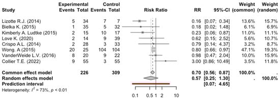 The quantitative synthesis included eight studies for the primary outcome (tracheal intubation), seven for the secondary outcome bradycardia, and six for the secondary outcome hypotension. The total number of patients enrolled in the eight studies exploring tracheal intubation was 535: 226 patients received dexmedetomidine and 309 received benzodiazepines or benzodiazepines plus propofol. Of these 226 patients who received dexmedetomidine, 49 were intubated, while 150 patients in the control group were intubated. The meta-analysis of the eight studies evaluating tracheal intubation did not show a significant intubation reduction in AWS patients receiving dexmedetomidine, RR: 0.57, 95% CI: 0.25–1.3, p = 0.15. The degree of heterogeneity across studies was high (I2 = 73%, p < 0.01) (Figure 2).