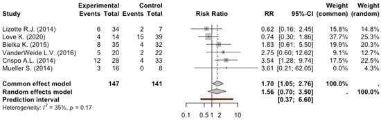 We performed a meta-analysis using the Mantel-Haenszel method to calculate the (fixed-effect) weights of studies with binary outcome data [28]. Furthermore, a more conservative approach (inverse variance method) with the random-effects estimates of risk ratio (RR) for each outcome, which allow for the variation of real effects across studies, was taken as “main results” [29]. We quantified heterogeneity using the I2 statistic, which describes the percentage of total variation across studies that was attributable to heterogeneity rather than to chance. I2 values of 25%, 50%, and 75% correspond to cut-off points for low, moderate, and high degrees of heterogeneity. We quantified the between-study variance with the Paule–Mandel Estimator, which assumes that the true effect sizes of the studies are normally distributed around some overall effect size. It is a method for estimating τ2, particularly in the context of a random-effects model in meta-analysis. It was preferred because it can provide more reliable estimates of τ2 in meta-analyses with a small number of studies [30]. The Q-Profile method was used to construct confidence intervals for τ2 and τ. The Hartung–Knapp adjustment was used to improve the accuracy of confidence intervals for the overall effect size. To deal with zero cell frequencies, a small number (0.5) was added to all cells of the contingency table, including those with zero values (Continuity Correction of 0.5). All analyses were performed using R software version 4.3.3 (29 February 2024) “Angel Food Cake” [8].
