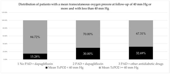 When analyzing the distribution of patients (feet) with mean TcPO2 control values of less than 40 mm Hg and of 40 mm Hg or more by group, the largest proportion of patients (feet) had mean TcPO2 control values of ≥40 mm Hg (145 feet or 74.74% of the total number), while a smaller proportion of patients (feet) had mean TcPO2 control values < 40 mm Hg (49 feet or 25.25% of the total number). A slightly higher proportion of patients with mean control TcPO2 less than 40 mm Hg was found in the group with PAD treated with other antidiabetic drugs (17 feet; 32.69%) than in the group with PAD treated with dapagliflozin (21 feet, 30%), and the lowest proportion was found in the group without PAD treated with dapagliflozin (11 feet, 15.28%). The observed differences in the frequency of patients with TcPO2 < 40 mm Hg differed significantly between the three patient groups (p = 0.046), but not significantly between the two groups with PAD (2 vs. 3 p = 0.751). (Table 6, Figure 1).
