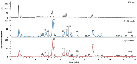 LC chromatogram and base peak chromatograms in the positive and negative ion modes of SYT extracts confirmed by UPLC-Q-Orbitrap-MS. Information on each compound corresponding to each number is presented in Table 1.