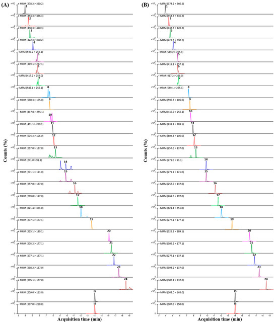 Multiple reaction monitoring (MRM) chromatograms of the 24 compounds in the (A) SYT extracts and (B) standard mixture.