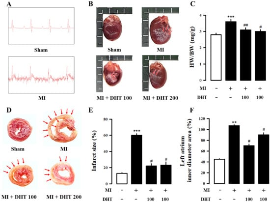 2.2. Effect of DHT on Infarct Size and Electrocardiogram Changes in MI-Induced Heart Failure Rats