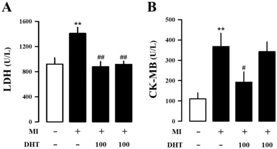 Hematological and serum biochemical analyses provide crucial information for assessing MI-induced heart failure. MI leads to elevated levels of myocardial-associated isoenzymes creatine kinase myocardial band (CK-MB) and lactate dehydrogenase (LDH) in the serum. Our results showed a significant increase in LDH (Figure 2A) and CK-MB (Figure 2B) levels in MI rats compared to the sham group, while these levels were significantly decreased in the DHT-treated group. Thus, DHT administration demonstrated an improvement in MI-induced heart failure.