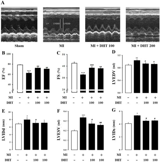 Parameters such as LVEDV, LVESV, LVIDd, and LVIDs were assessed. Treatment with DHT improved these echocardiographic parameters, indicating the amelioration of cardiac remodeling and dysfunction following myocardial infarction.