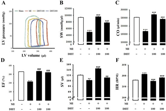 The Millar pressure-volume (PV) conductance catheter system was used to evaluate LV performance and obtain LV pressure-volume relationships (PV loop). PV loop analysis revealed typical heart failure symptoms, including increased volume and decreased pressure, in the MI group compared to the control group. However, these symptoms were ameliorated with DHT treatment (Figure 4A). The hemodynamic parameters stroke work (SW, Figure 4B), cardiac output (CO, Figure 4C), ejection fraction (EF, Figure 4D), stroke volume (SV, Figure 4E), and heart rate (HR, Figure 4F) confirmed the improved hemodynamics in MI-induced rats following DHT treatment.
