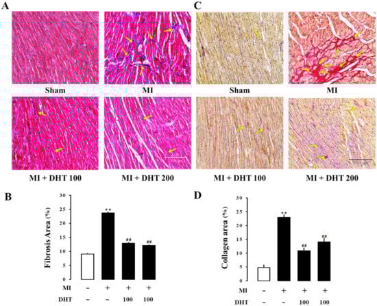 Histological analysis was performed to detect and quantify collagen deposition in the LV tissue of MI-induced rats. Masson’s trichrome staining (blue staining for collagen fibers, Figure 5A) and picrosirius red staining (red staining for collagen fibers, Figure 5B) were used to measure fibrosis in the LV tissue. The MI group exhibited increased collagen deposition in the left ventricle, while DHT treatment showed improvement in fibrosis. These results suggest that DHT administration ameliorates cardiac fibrosis.