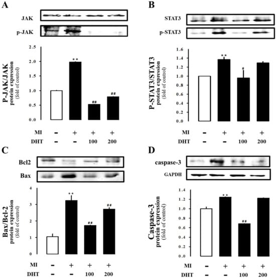 To gain insights into the cardioprotective effects of DHT, we investigated the myocardial JAK/STAT3 signaling pathway at the molecular level. The MI-induced heart failure rats showed increased expression of JAK/STAT3 signaling parameters in left ventricular tissue, which significantly exacerbated myocardial apoptosis. However, treatment with DHT suppressed the expression of phospho-JAK, phospho-STAT3, Bax/Bcl-2, and caspase-3 proteins (Figure 6). These findings indicate the beneficial effects of DHT through the modulation of JAK/STAT3 signaling.